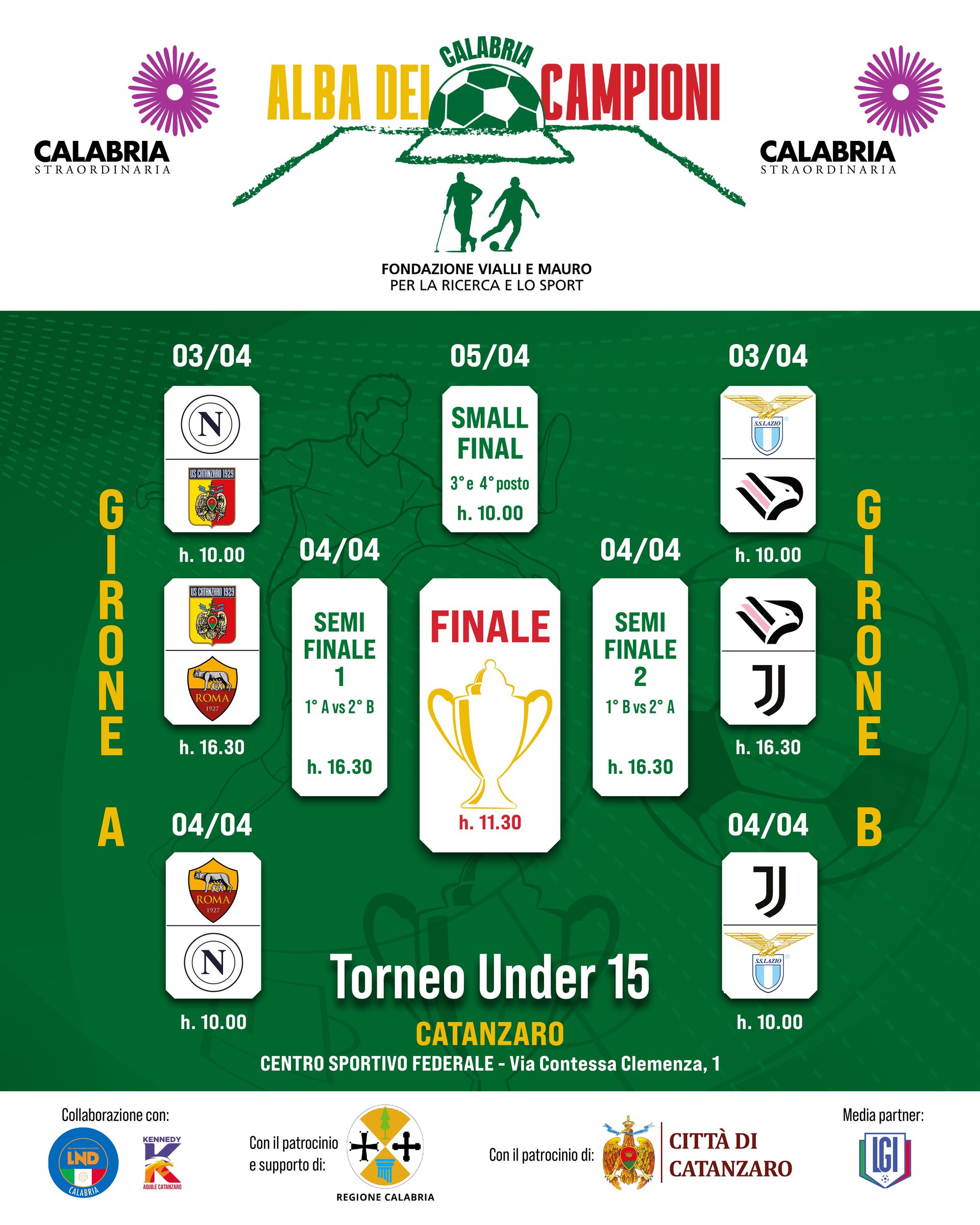 Dal 3 al 5 aprile, infatti, grazie al prezioso supporto del Comitato Regionale Figc-Lnd Calabria nella persona del presidente Saverio Mirarchi, il Centro Sportivo Federale della città aprirà le porte a sei tra i più prestigiosi club italiani che si sfideranno con le rispettive squadre Under 15: AS Roma, Juventus FC, S.S. Lazio, SSC Napoli, Palermo F.C., e US Catanzaro 1929.