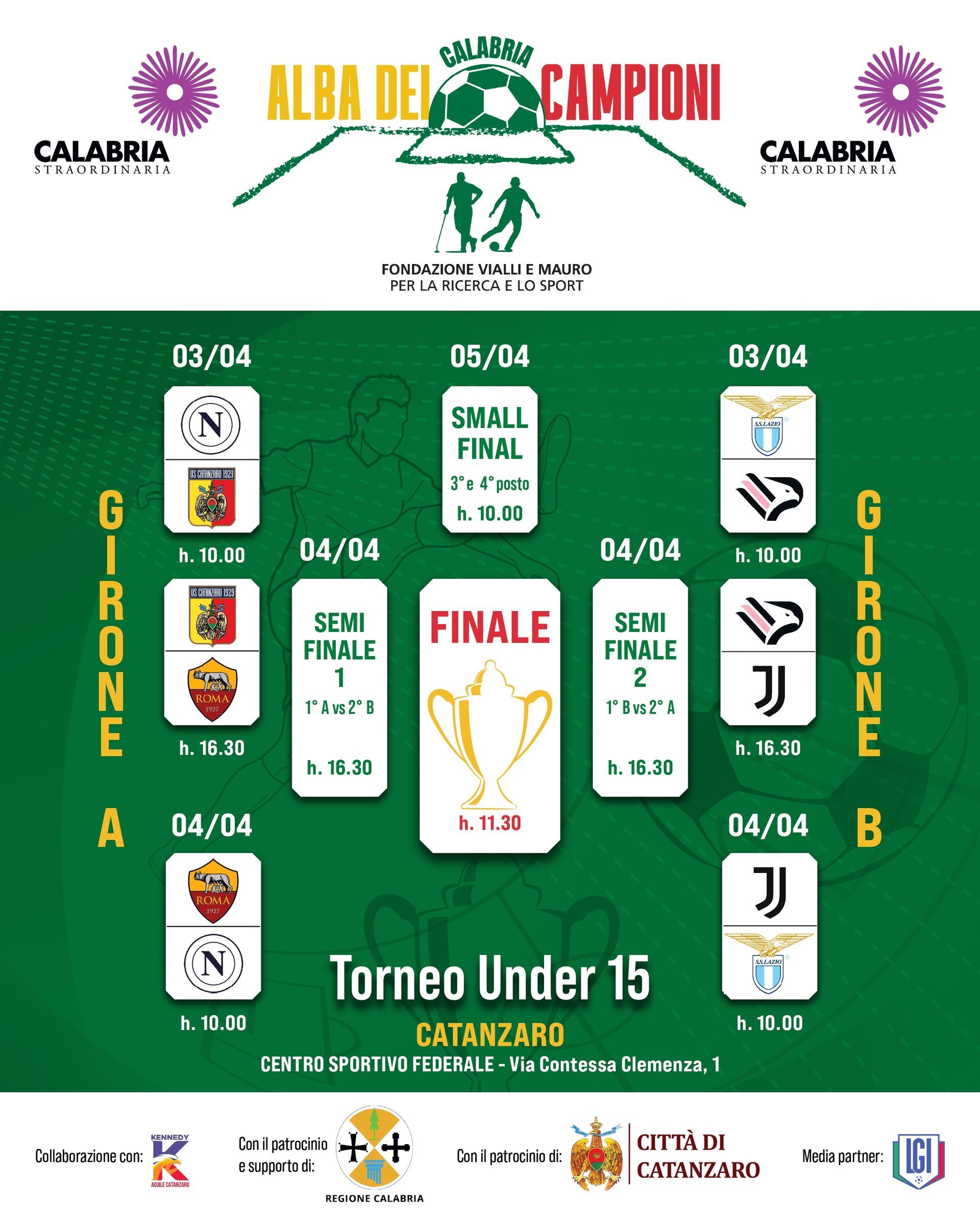 Dal 3 al 5 aprile, infatti, grazie al prezioso supporto del Comitato Regionale Figc-Lnd Calabria nella persona del presidente Saverio Mirarchi, il Centro Sportivo Federale della città aprirà le porte a sei tra i più prestigiosi club italiani che si sfideranno con le rispettive squadre Under 15: AS Roma, Juventus FC, S.S. Lazio, SSC Napoli, Palermo F.C., e US Catanzaro 1929.